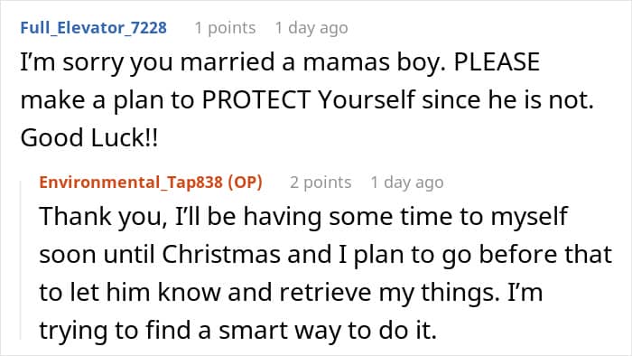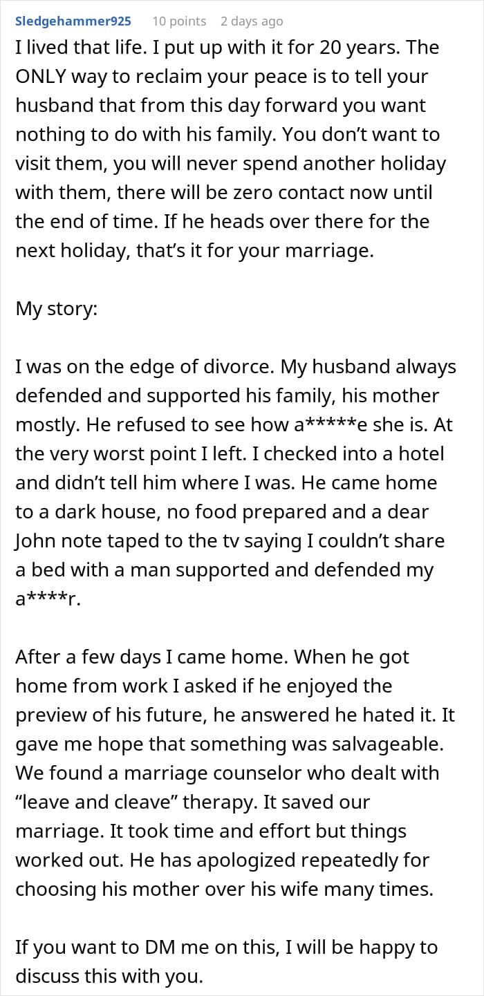 Through it all, her husband has been a brick wall of defense…for them. He dismisses her feelings as being “too sensitive,” insists there’s “no bad intention,” and is more concerned with not upsetting his family than with supporting his wife. Now, feeling completely invisible, she’s dreading another lonely Christmas with them and is seriously contemplating giving him divorce papers as an early holiday gift.