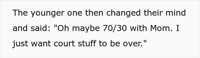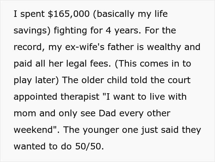 Despite his fight, the battle was ultimately decided by his teenage kids in court. The older one clearly chose to live with mom, while the younger one, exhausted by the process, caved under the pressure and opted for a 70/30 split. The judge sided with their preferences, and the dad lost the equal custody he’d bankrupted himself for.