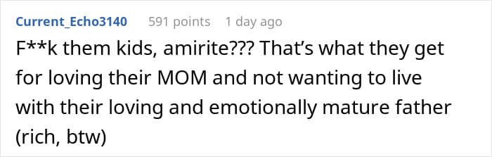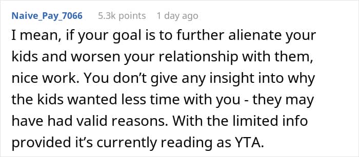 When his kids pressed the issue, the dad delivered a cold, hard dose of reality: “Choices have consequences. One of them is that you don’t get to join me on things like this.” His younger child shot back with a classic teenage zinger: “You’re just mad we have more fun at Mom’s house.” Now, the dad is left wondering if he’s teaching a fair life lesson or just being a bitter, punishing jerk.