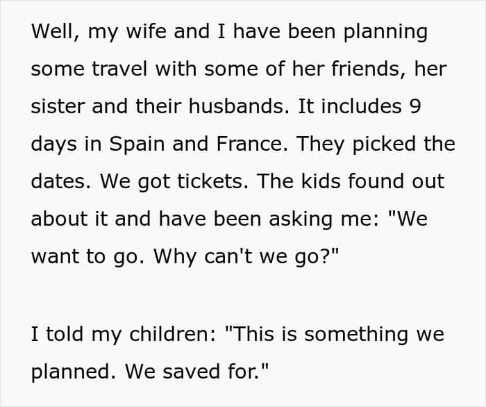 Fast forward to the present, where the dad and his new wife are planning a dream trip to Spain and France. The kids found out and, naturally, wanted in. Their hopes were dashed when he told them no, and their “it’s not fair” argument was supercharged when they learned their 15-year-old cousin was invited, proving it wasn’t an adults-only affair.