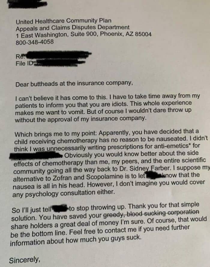 #1 A Doctor’s Letter To United Heathcare For Denying Nausea Medication To A Child On Chemotherapy