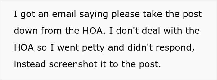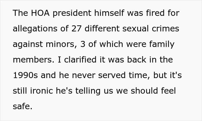 The OP’s decision to take on his homeowners’ association was quite brave, and he made sure to expose their hypocrisy. In their letter to parents, they had mentioned that their neighborhood was safe for kids, but just a while back, there had been a 6-hour armed standoff, and the HOA’s president had been fired for assaulting minors.