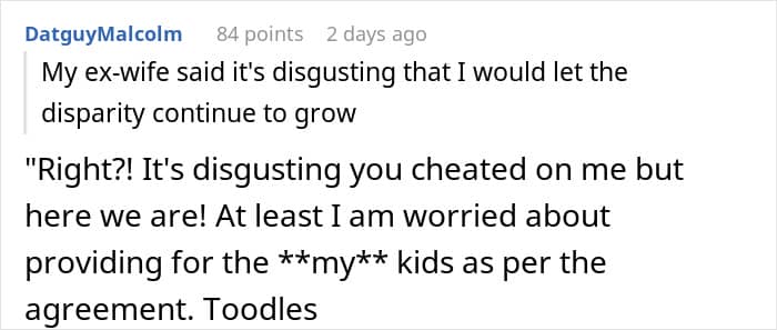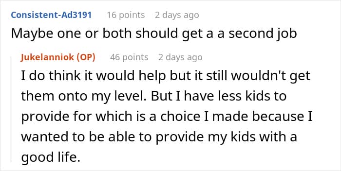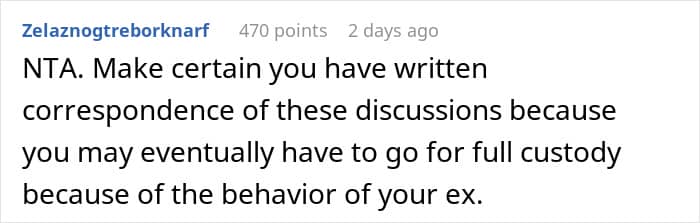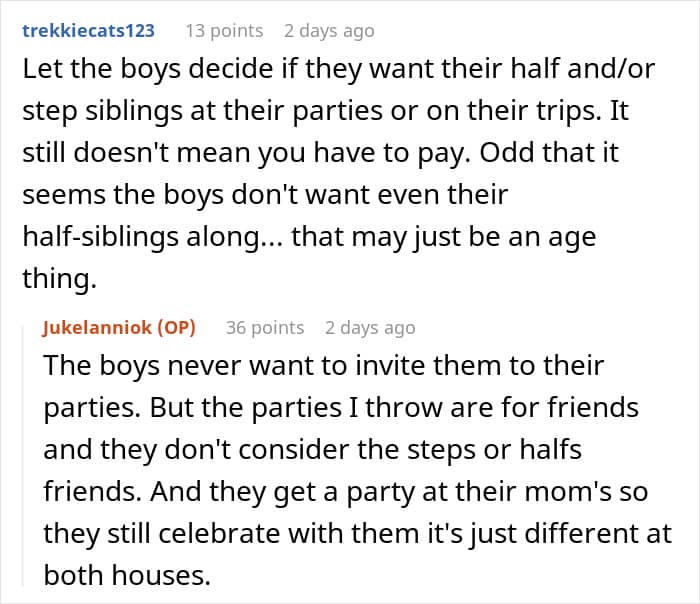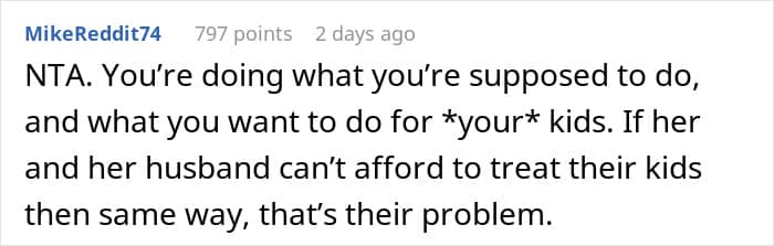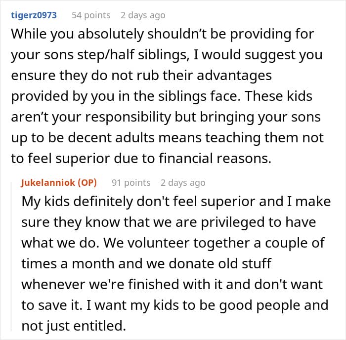 Netizens sided with the OP, emphasizing that he is only responsible for his own children and should not feel pressured to provide for his ex-wife’s other kids. Many noted the importance of maintaining boundaries and documenting discussions, also highlighting that the disparities are a result of the ex-wife’s choices, not his actions.