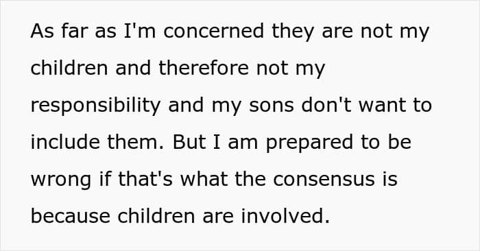 However, the OP maintained that he was not responsible for children who were not his own, and also emphasized that activities should remain separate, and his sons prefer it that way. Still, this left him feeling like he might be wrong in his approach.