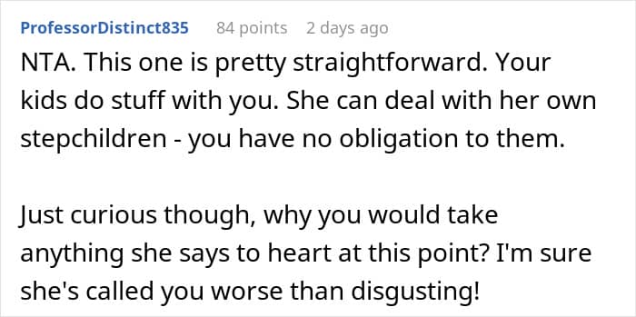 The OP took his sons on an extended vacation that included trips with his family, and this was when the ex-wife popped her head in. She demanded that her other children be included, arguing that the growing gap was “disgusting” and showed a lack of concern.