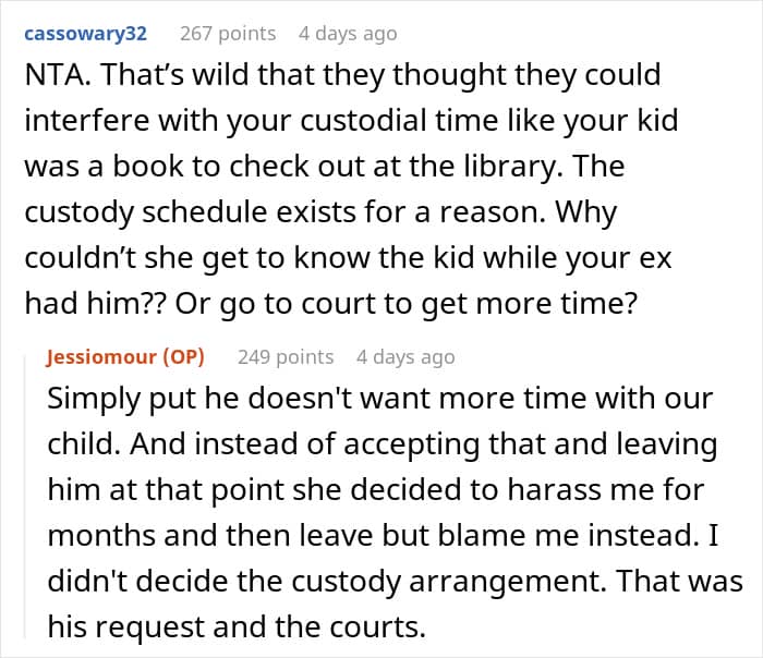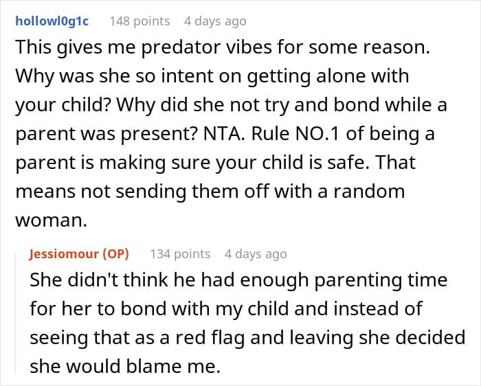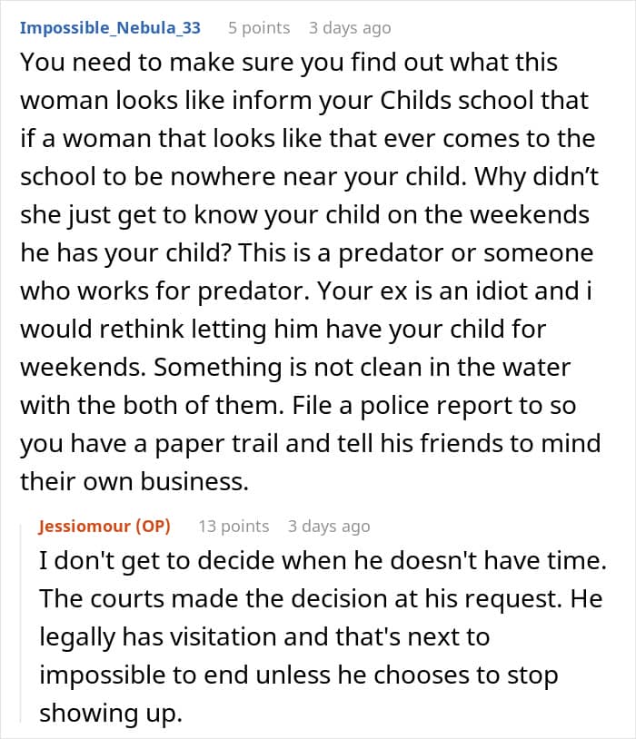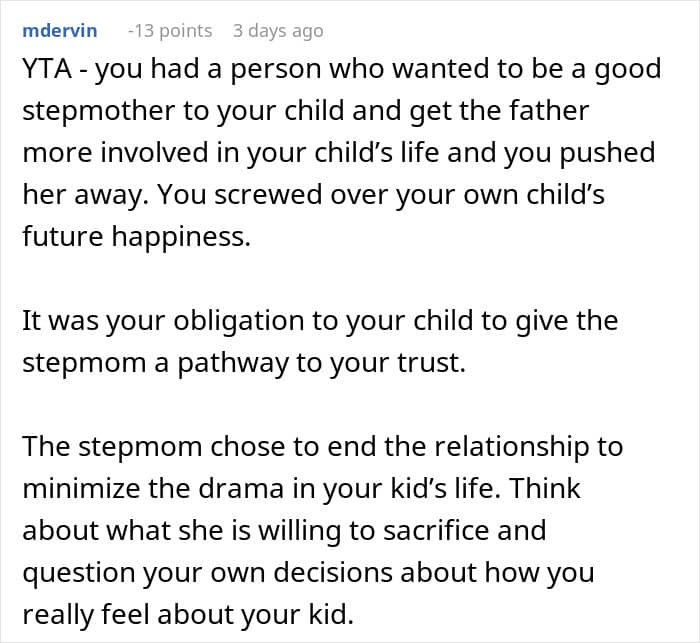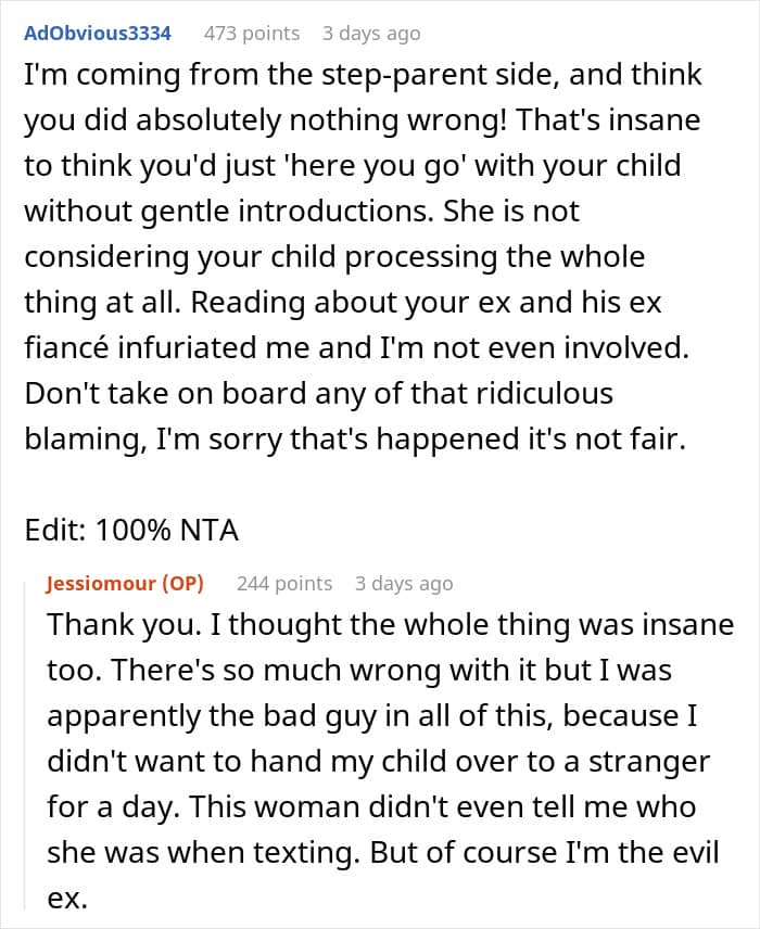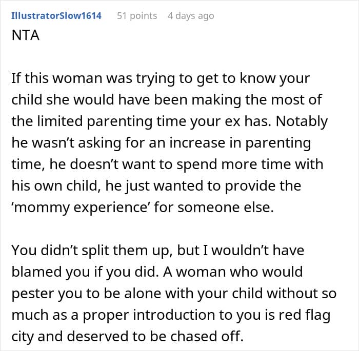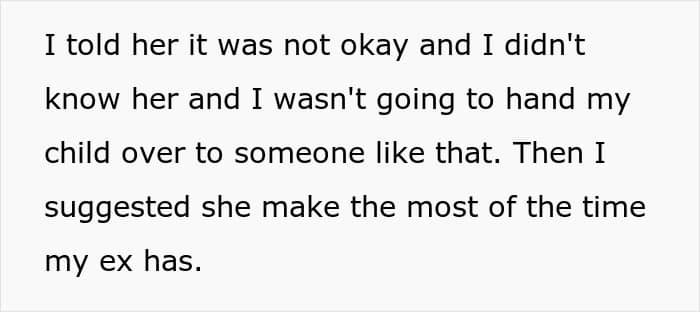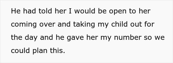 Unfortunately, this parent didn’t bother introducing his fiancée to his kid and biological mom. They found out about her when she started blowing up the mom’s phone, asking, almost demanding, to hang out with her future stepkid alone. Since she was a complete stranger to the mom, she refused such requests, sparking quite a bit of drama between the adults.