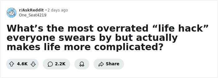 A few days ago, a thread appeared on AskReddit, whose author, the user u/One_Seat4219, asked other netizens: “What’s the most overrated ‘life hack’ that everyone swears by but actually makes life more complicated?” The question turned out to be quite relevant – at least today, the thread already has almost 5K upvotes and about 2.5K different comments.