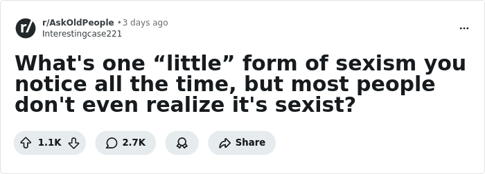 So someone asked “What’s one “little” form of sexism you notice all the time, but most people don’t even realize it’s sexist?” and people shared their thoughts. So get comfortable as you scroll through, upvote the most important examples and be sure to add your own thoughts and stories in the comments section down below.