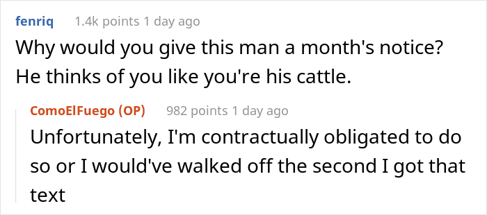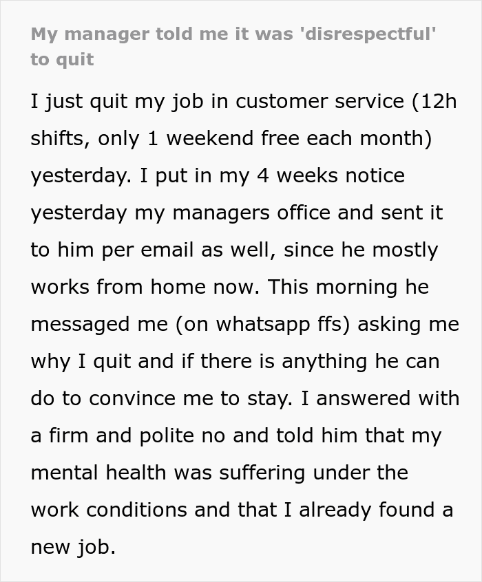 It turns out his manager was far from impressed with his employee quitting, so he messaged him via Whatsapp to try and convince him to stay. “I feel like I just broke up with a crazy ex,” the Redditor wrote after saying how the manager started pressuring him, making fun of him, and even calling him disrespectful.