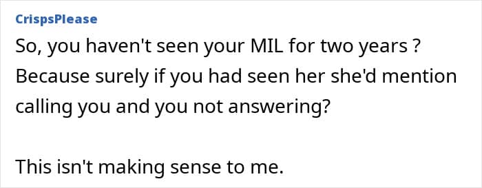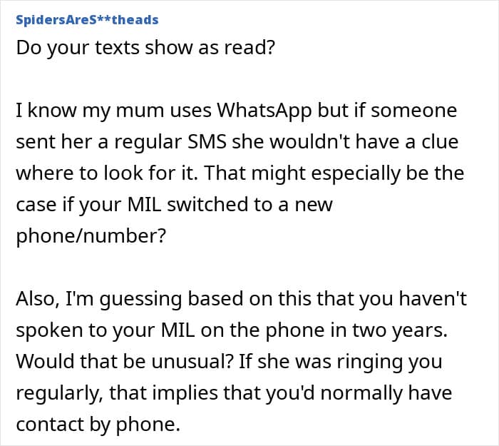 Then, during a medical appointment day at home, the mystery number called again, this time while she was in the shower. Later, her husband asked for the number and, when she sent it, he dropped the bombshell: the unknown caller was his mother. OP was speechless.