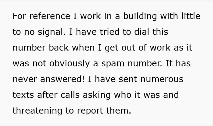 She even tried calling back after work, but the mystery caller never picked up. At her wits’ end, OP assumed it was spam, or worse, someone harassing her because of her job, which frequently involved disciplining people. The calls went on for months, leaving her anxious and suspicious about who could possibly be behind them.