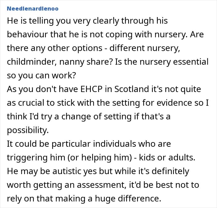 Netizens suggested that the nursery may not be the right environment and recommended considering alternatives, highlighting the need to move away from strict sanctions, since they appear ineffective. Some also suggested that the son’s reactions may be linked to neurodivergence.