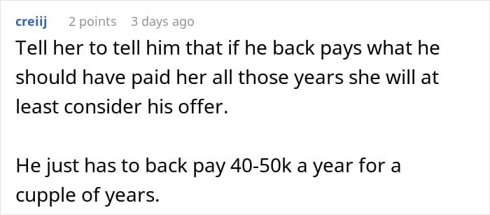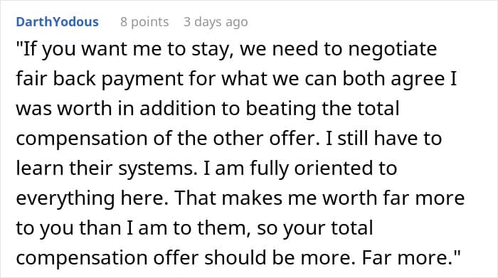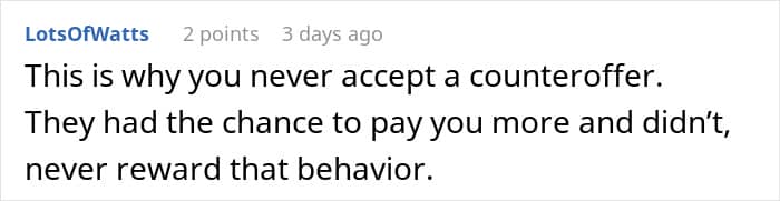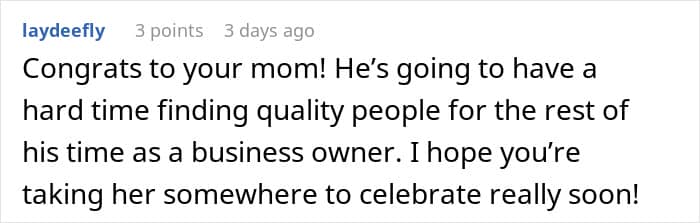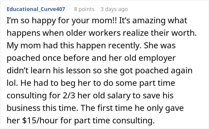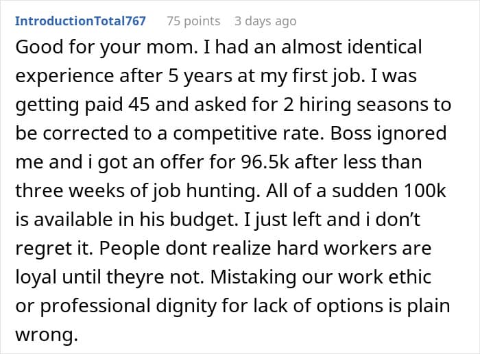According to the author, their mom spoke up and asked for a raise, which was immediately denied. Fortunately, a much better offer landed on her lap, which allowed her to turn the tables and reject her boss’s desperate counteroffer.