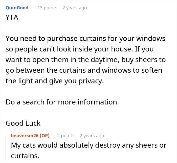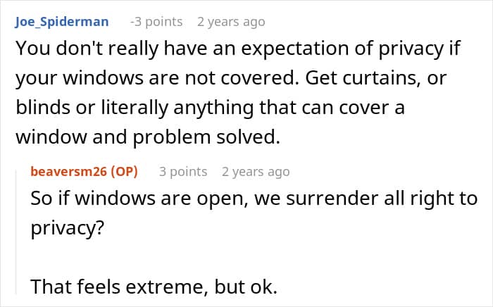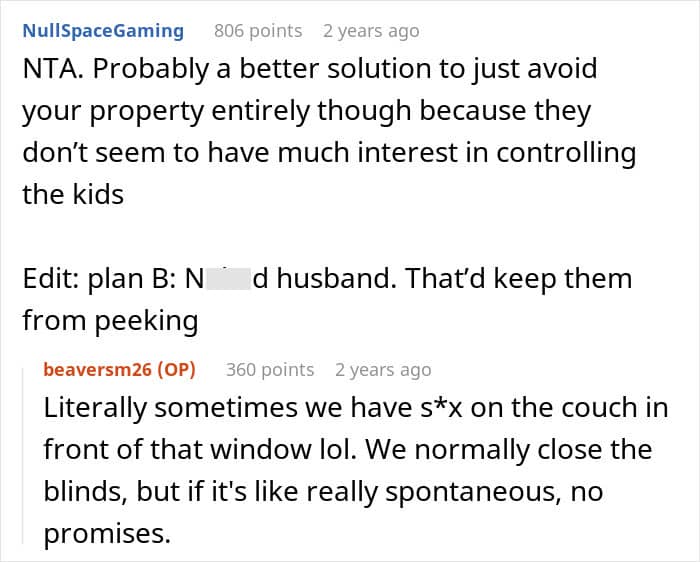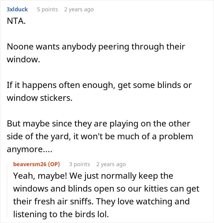 Well, OP’s attempt at a polite request seemed to fall on deaf ears. Perhaps the grandmother’s solution to the problem, despite her lousy attitude, was the best one. After all, nothing says “stop peeking through her windows” like “stay out of her yard.”