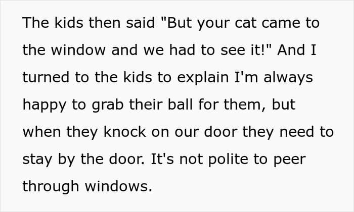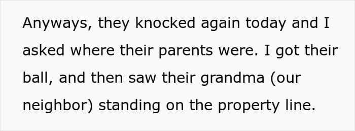 When they returned the next day, she politely asked where their parents were and returned the ball. Their grandmother was nearby, and when the OP mentioned she didn’t like the kids looking through her windows, she dismissed it, all while the boys kept staring inside like they owned the place.