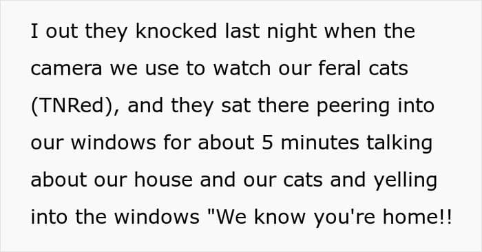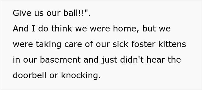 One evening, OP checked her outdoor camera and saw the kids pressed up against the glass, yelling, “We know you’re home! Give us our ball!” for nearly five minutes. She hadn’t heard the door because she was in the basement caring for sick foster kittens, unaware of the children’s commotion.
