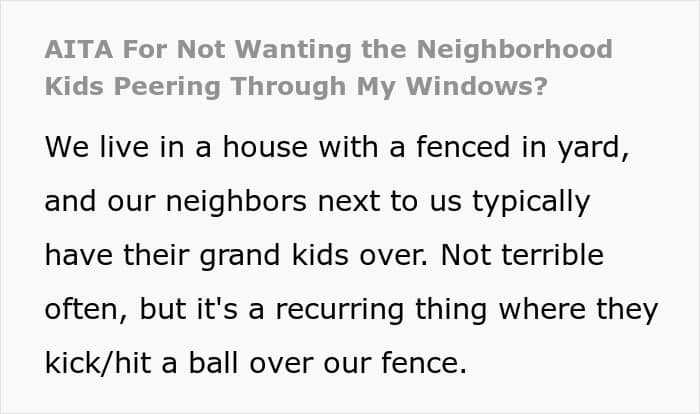 The original poster (OP) and her husband share a quiet house with a fenced yard, next to neighbors who often host their grandkids. The kids sometimes kick balls over the fence, and OP never minded helping retrieve them. But recently, things crossed a line when the kids began peering through the couple’s windows after knocking.