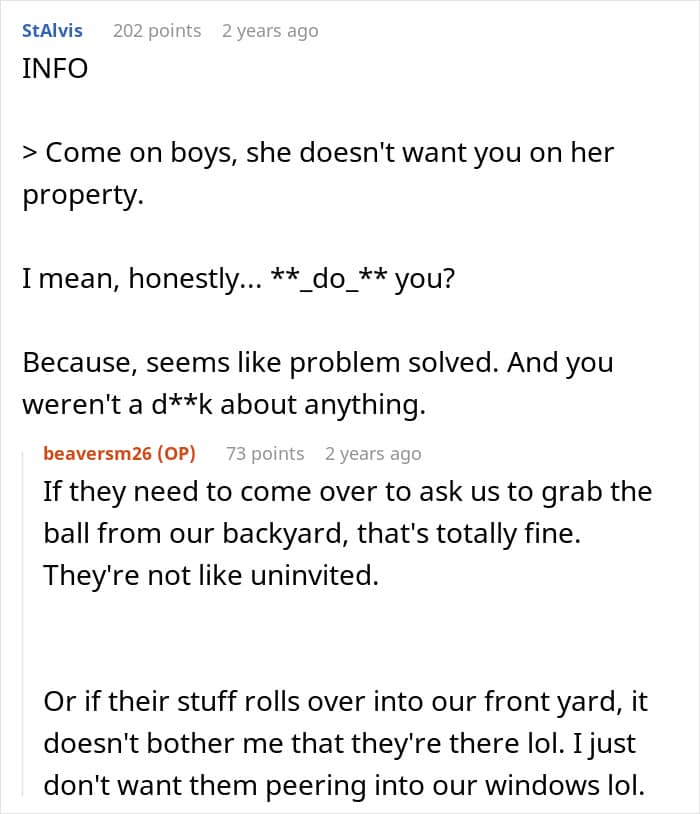Trying to stay calm, OP explained she didn’t mind fetching balls, asking only that they stay by the door instead of peering in. Their grandmother, however, took offense, telling the kids to “stay off her property.” Now OP is wondering: was asking for privacy unreasonable, or did a basic boundary somehow make her the neighborhood villain?