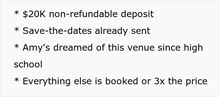 The aunt insisted she couldn’t attend the wedding at that venue, even offering to cover the $20K deposit herself