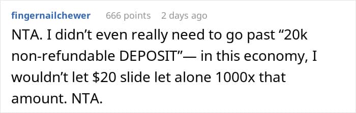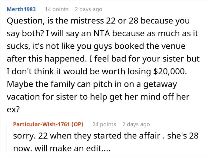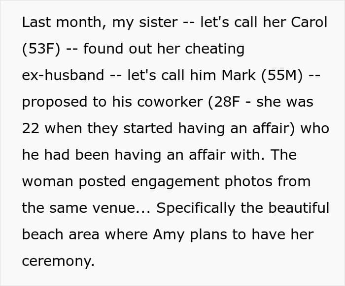 Take this story, for example: A woman placed a $20K non-refundable deposit on her daughter’s dream beachside wedding venue, only for her sister to beg her to change it. Why? Because the sister’s cheating ex-husband had just proposed to his much-younger fiancée at the exact same spot. Now, with emotions running high and a fortune already invested, the family is torn between honoring loyalty and keeping the dream wedding intact. Keep reading to see how it all unfolds.