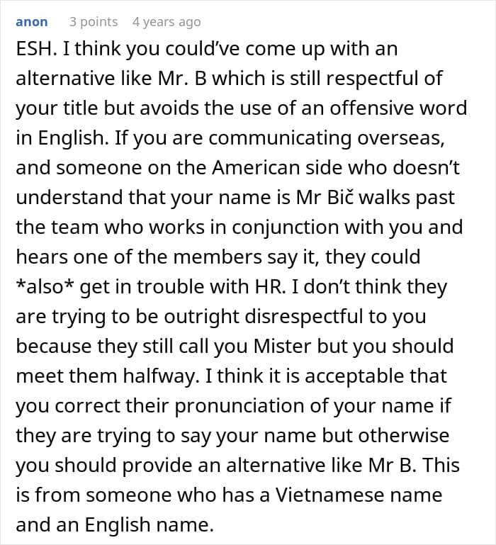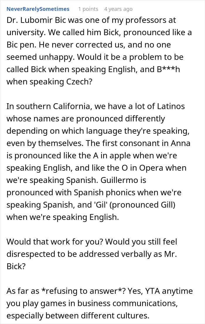 After he introduced himself, he realized his American colleagues couldn’t handle how his last name sounded in English. He refused to be called anything else, which led to a standoff with no suitable alternatives.