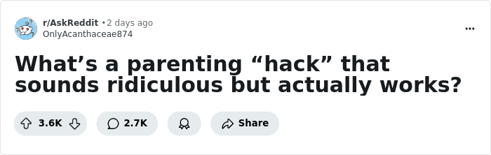 Sometimes, the only way to get kids to cooperate is by trying something a little unconventional. That’s why one Redditor asked parents to share the parenting hacks they rely on—tips that may sound absurd at first but end up saving everyone’s sanity. Scroll down to see them all, and who knows, you might find your next go-to trick!