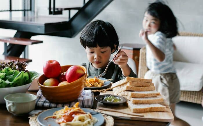 Use scissors to cut their food up into smaller pieces. So much faster. .