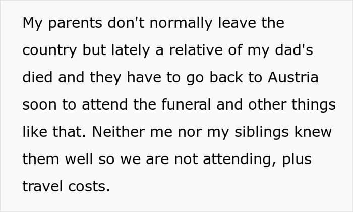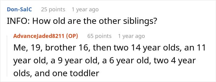 Even though the poster and her brother tried to appeal to their parents about hiring a babysitter or asking friends for help, all of their suggestions were turned down. Since both adults were quite reclusive, they didn’t want anyone else to help out and were okay with their kids stretching themselves to their limit.