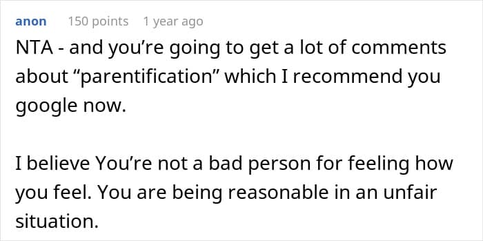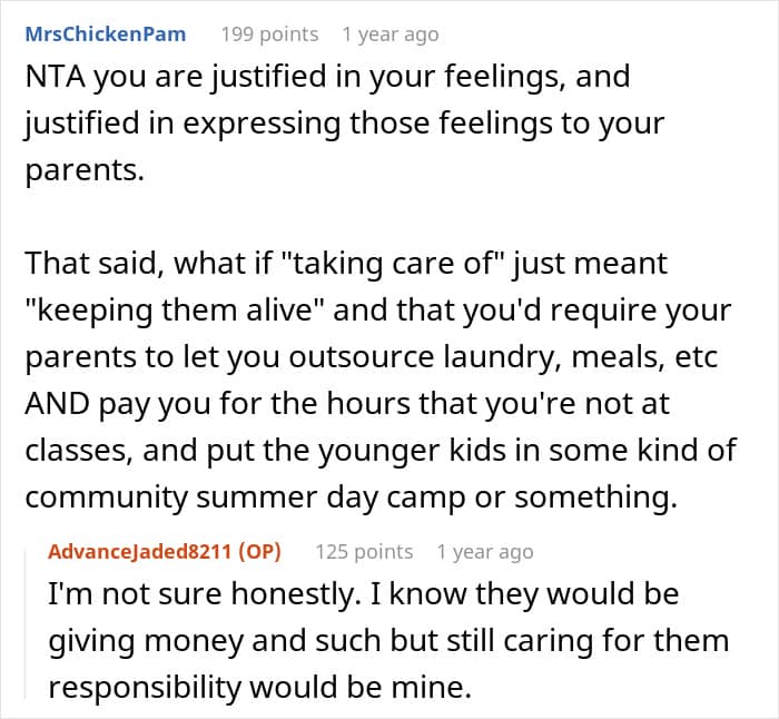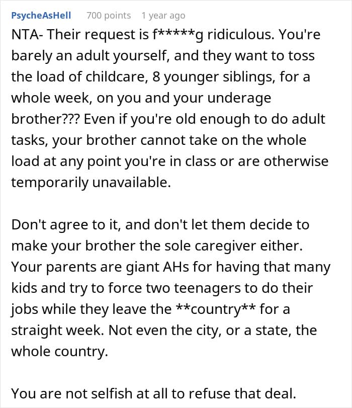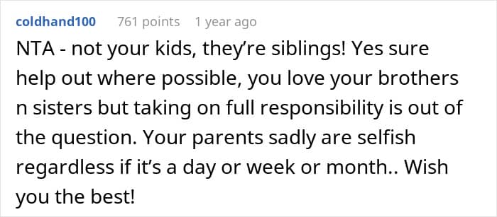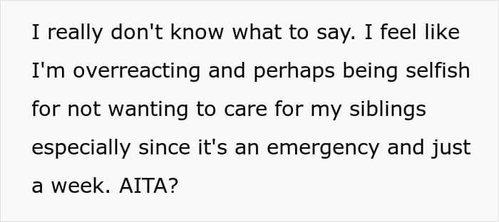Eventually, the poster realized that she had to put her foot down or else she’d end up facing burnout. So, even though she felt selfish saying it, she told her parents that she would not be babysitting her siblings for the week while they were away.