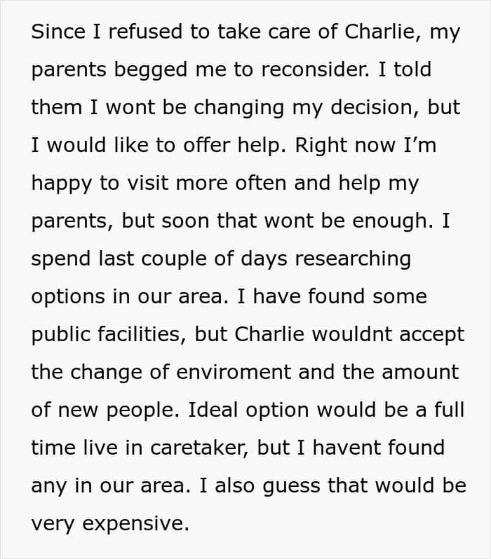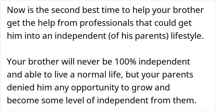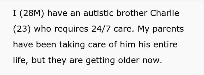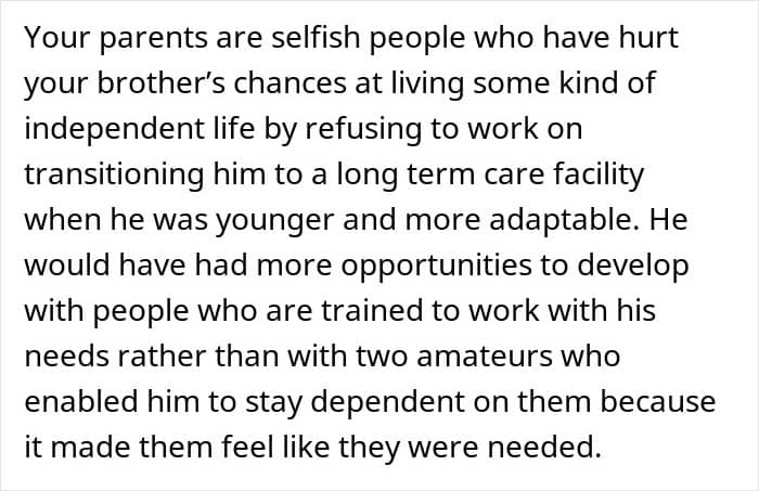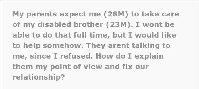 A man asked the internet for advice on how to handle a family situation that arose when his parents asked him to take in his non-verbal autistic brother. When he initially refused, they stopped talking to him. We reached out to the man who made the post via private message and will update the article when he gets back to us.
