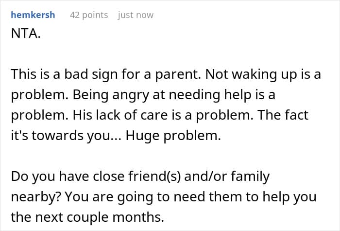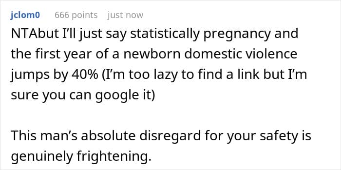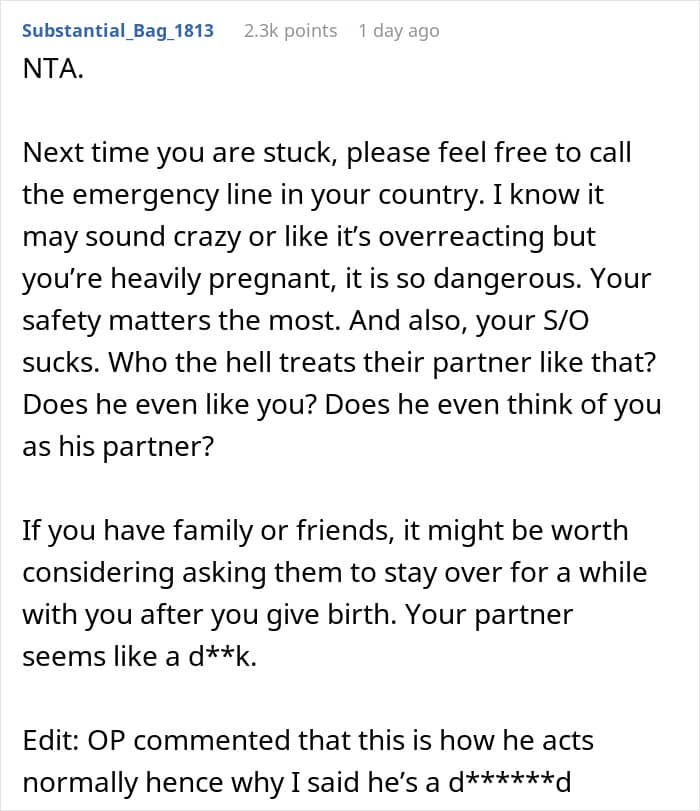 Netizens expressed shock and concern over the partner’s behavior, with many highlighting how his reaction was inappropriate given the circumstances. They labeled him as inconsiderate and a red flag, warning the OP about potential future issues, especially once a newborn arrives.