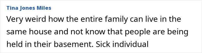 “Find it impossible to believe that four adults are living in the basement of your house and you have no idea,” a reader wrote. “Life without parole for this sicko. In chains or whatever he used with his victims.”