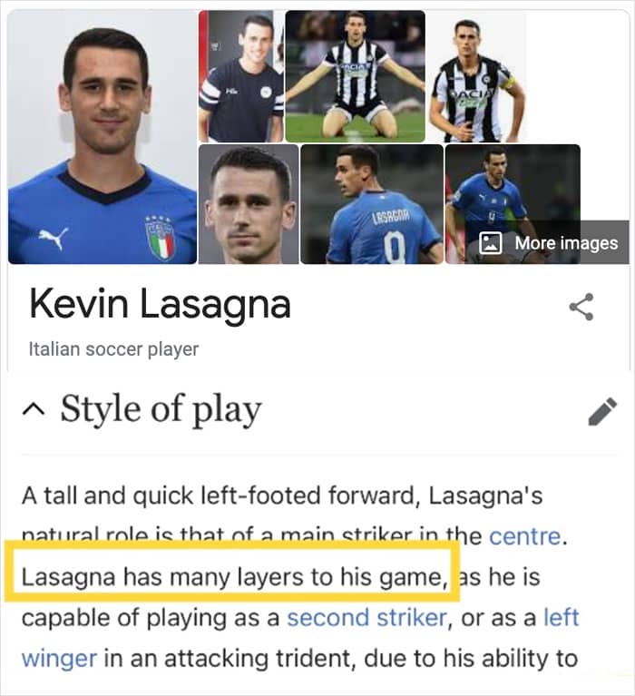 Now most non-visual jokes are a form of storytelling. There is a setup, normally of some information, then a punch line as a finisher. The setup should be vague enough that the punch is unexpected, which humans tend to find amusing. We like it when we are surprised, and often this is achieved by subverting certain expectations. Many of the jokes in this list work in a similar manner, we see lasagna puns in a Wikipedia article about a football player which is not where we expect Italian-food-based puns.