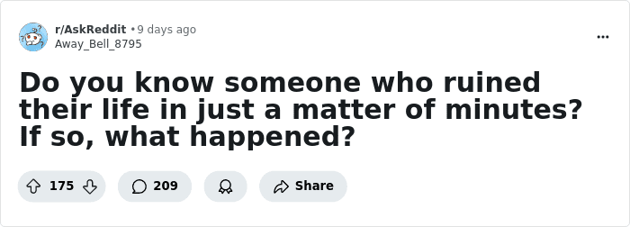 A few weeks ago, a thread appeared on AskReddit, the author of which, the user u/Away_Bell_8795, asked people the question: “Do you know someone who ruined their life in just a matter of minutes? If so, what happened?”