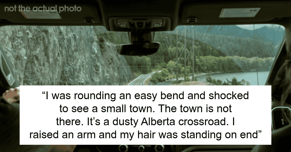In 1989 I was driving on a familiar rural highway in broad daylight. I was rounding an easy bend and shocked to see a small town on the right side of the road. There’s a sign: St. Vincent. A few of the things immediately noticeable were a shop called Webster Welding, an old fashioned horse drawn water pump for fire fighting, several large poplars with dead tops, and black and white painted rocks along the street that faced the highway. I kept watching in the rear view mirror and it stayed visible. I drive a few miles and there is a gentleman waving at me from beside his car. He’s obviously broken down and I pulled over. A quick chat and I learn he’s blown a tire and wrecked his rim. He asks if I’ll drive him back to the town. No problem. In he gets and off we go. The town is not there. It’s a dusty Alberta crossroad. This fellow and I just sat in my truck in silence. I raised an arm and my hair was standing on end. His too. He said “All the trees were dead. Are we dead?” Eventually I drove him to a nearby town. He simply got out of the truck and walked away.