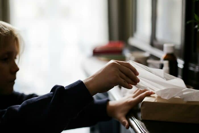 Bring home the paper bag and/or plastic sandwich bags from school lunch to be used again the next day (plastic ones were washed and dried overnight).