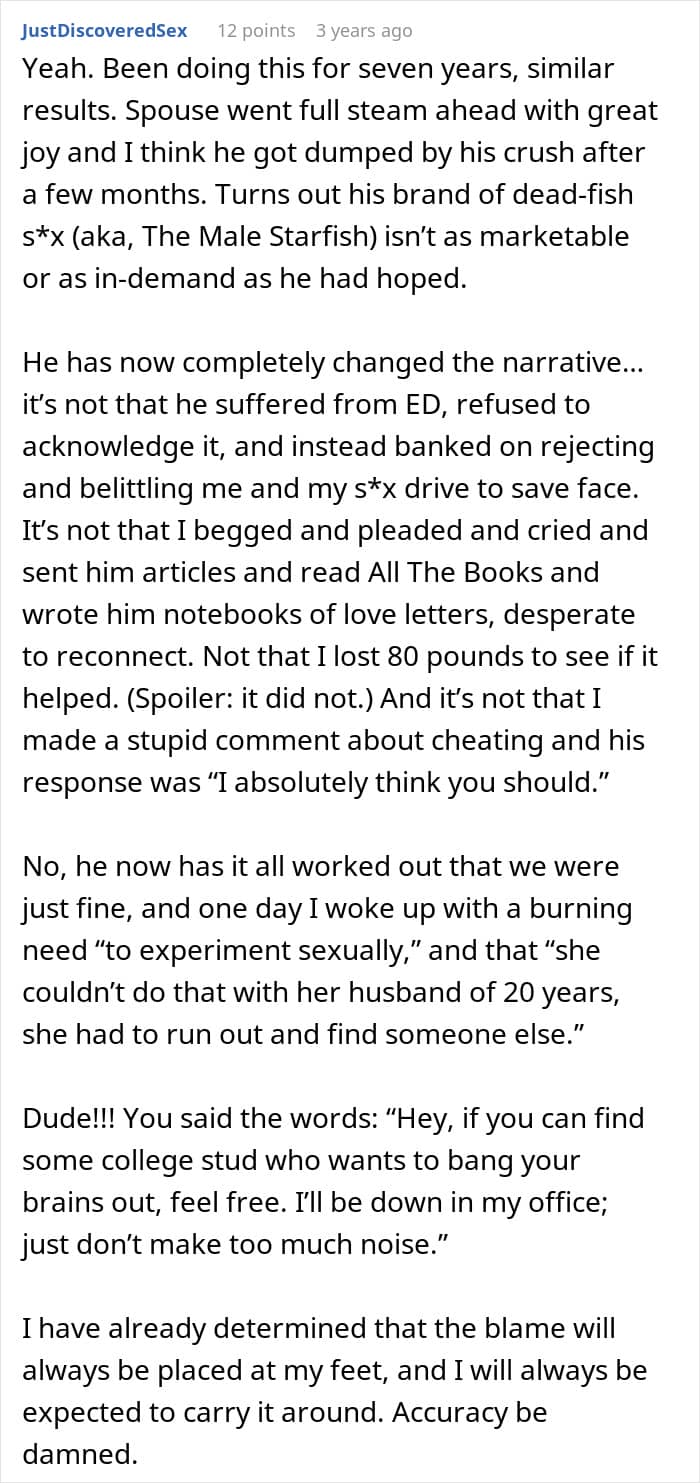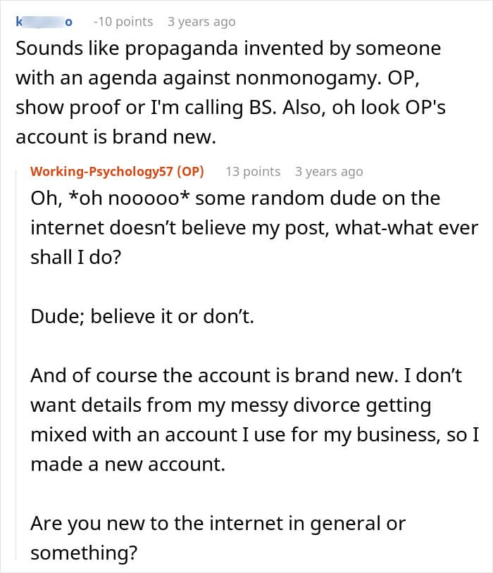 His accusation of cheating is not only hypocritical but factually incorrect based on the definition of consensual non-monogamy. The experts at Hello Prenup say that for an open relationship to work, it must have “open & honest communication, transparency, and agreement/consent,” otherwise, it’s just infidelity. The wife followed these rules perfectly. She had her husband’s enthusiastic consent, so she should be in the clear.