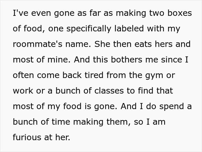 The author has a job, but it’s still expensive – he’s a student first and foremost, so he cannot spend every waking moment working. Even if he could, it wouldn’t change that much. No matter what the original poster did, his roommate kept eating his food until one day, she learned a lesson – and it was the one taught by him, by accident.