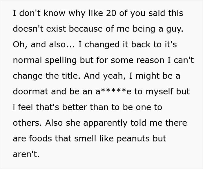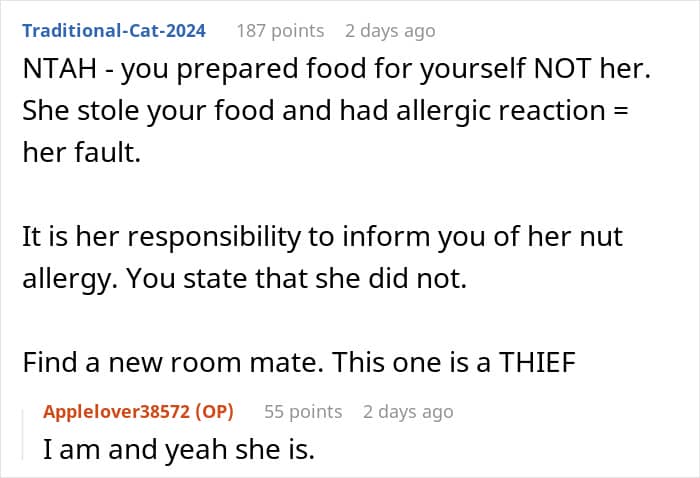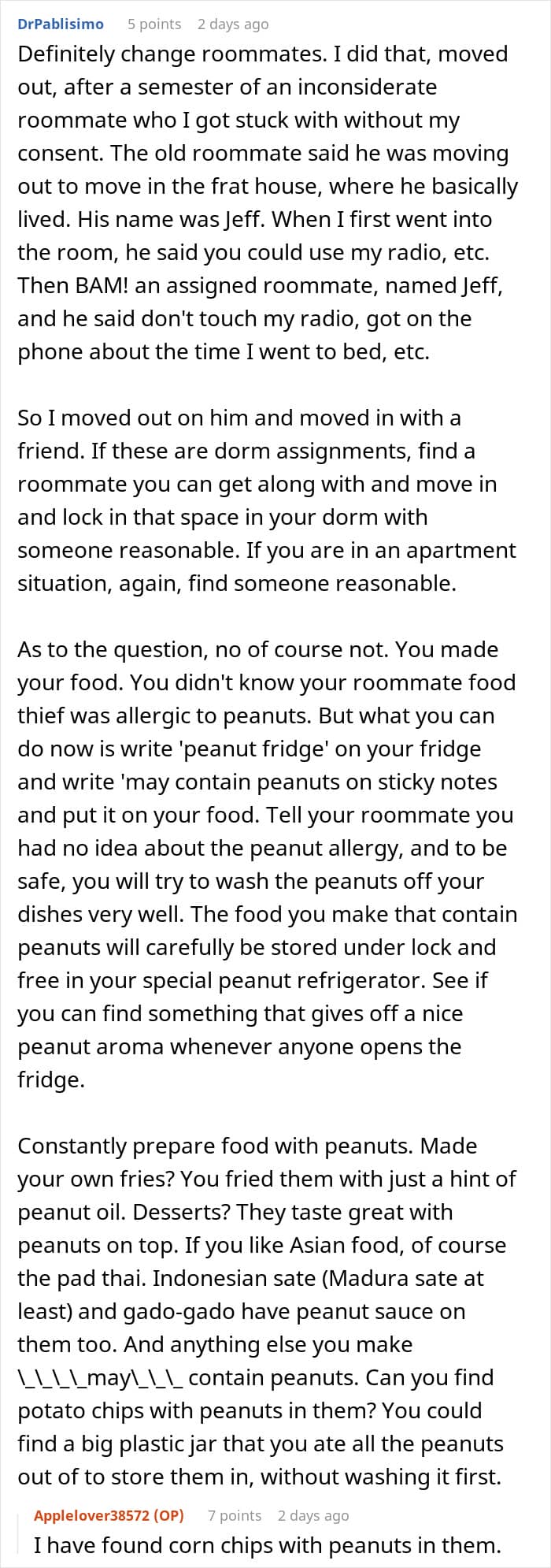 The thing is, while the OP was beyond annoyed by her stealing his food, he “poisoned” her with peanuts by accident–he never knew about her allergy. While it’s one of the more common allergies, you typically don’t go around assuming everyone has it, especially if they never mention a word about it.