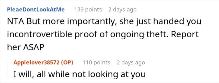 When called out on it, she tried justifying it by saying she thought the food was for both of them. Lady, doesn’t the lock suggest to you that it might not be? Even if it didn’t – she was told that. So, it was a poor explanation, but she still went with it.