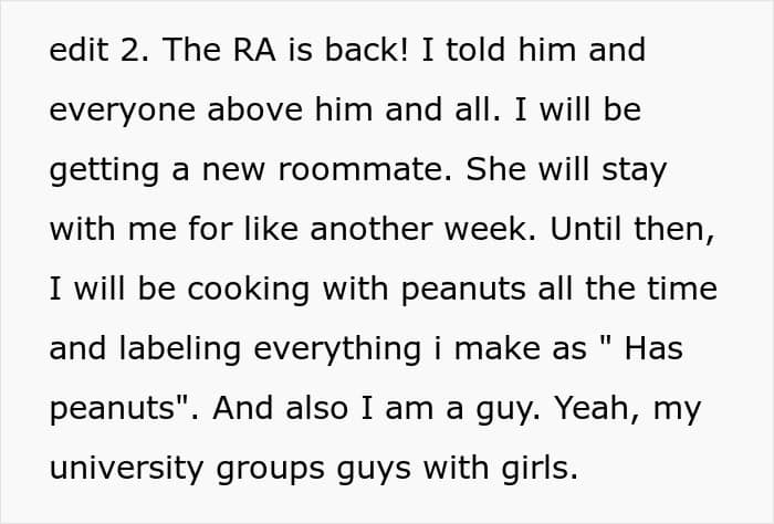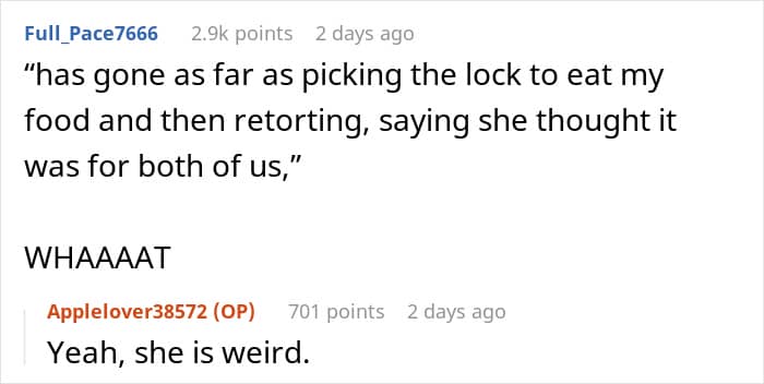 Recently, the OP started studying at a nice university and was paired to live in dorms with a female student, whom he described as “pure hell.” You might wonder – what did she do in just a couple of weeks to be dubbed this way? Apparently, she uses the man’s stuff without consent, which is kind of annoying, but something he could live with. What he couldn’t live with was her habit of stealing food.
