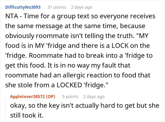 You see, the author’s mom has brought him a small fridge to keep his food in, so no one would take it. It even had a lock for safety. After all, stories about roommates stealing food are widespread. Just Google it and you find something like this one, where a roommate not only steals it, but also denies it. And that’s just one example out of a never-ending number of them.