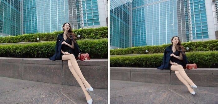 Slimming and body-shaping tools compress or stretch areas of an image, but will warp straight lines in the process. Lamp posts get subtly warped, door frames curve outward, and tile floors appear as if they’re wobbling. Check edges parallel to the frame of the photo, walls, floors, tables, carefully and see if they’re still straight. Any wiggle is a tip-off that the “liquify” or warp tool has been used on the subject.