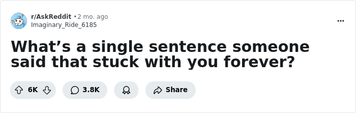 There’s a thread on AskReddit that was created a couple of months ago by the user u/Imaginary_Ride_6185, who asked netizens, “What’s a single sentence someone said that stuck with you forever?” As it turns out, such situations happen quite often in people’s lives, so the thread has become really popular.