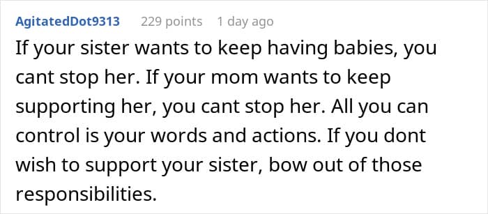 We were also curious about why the sister has decided to have so many children. “She’s always been family oriented, she said her dream was to have a big family,” her sister explained. “But we didn’t know she’d start this early. It also may be because she’s always getting special treatment while pregnant.” And in response to the comments on her post, the OP added that she was relieved to hear she hadn’t done anything wrong. “I knew deep down I wasn’t the AH,” she said.