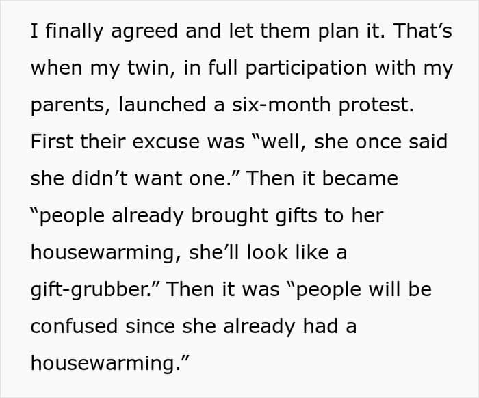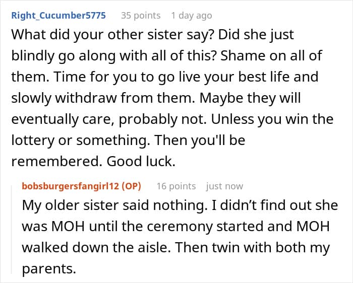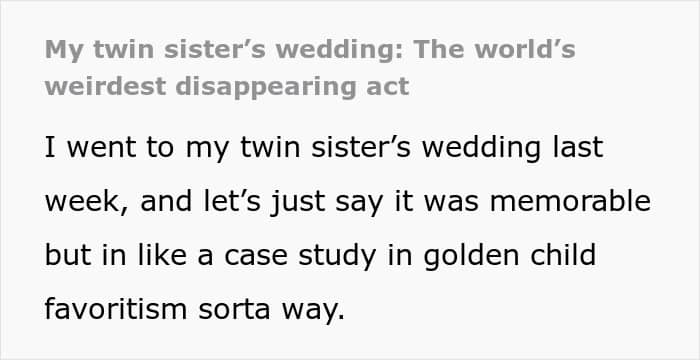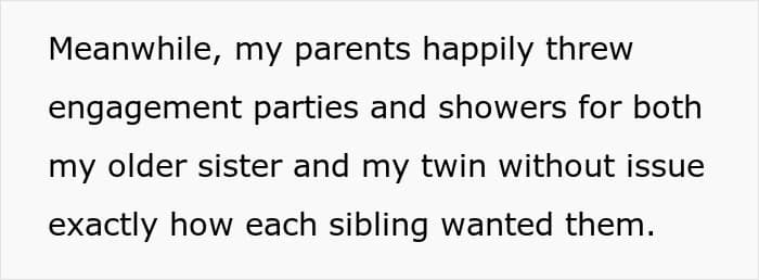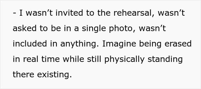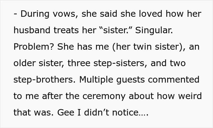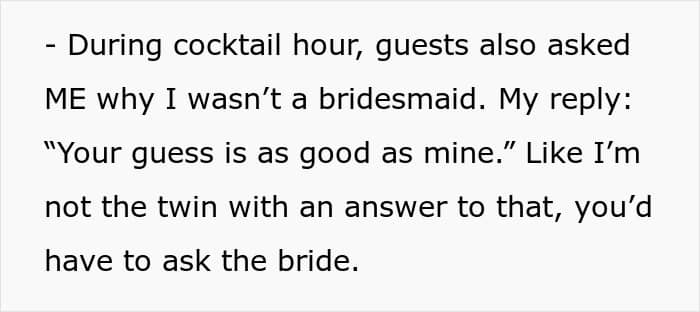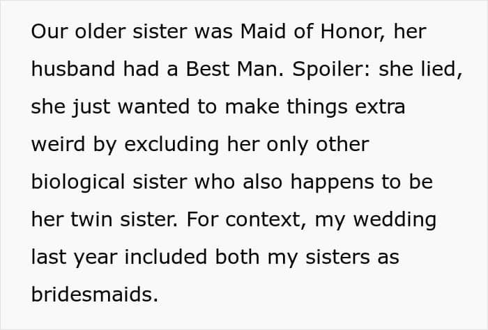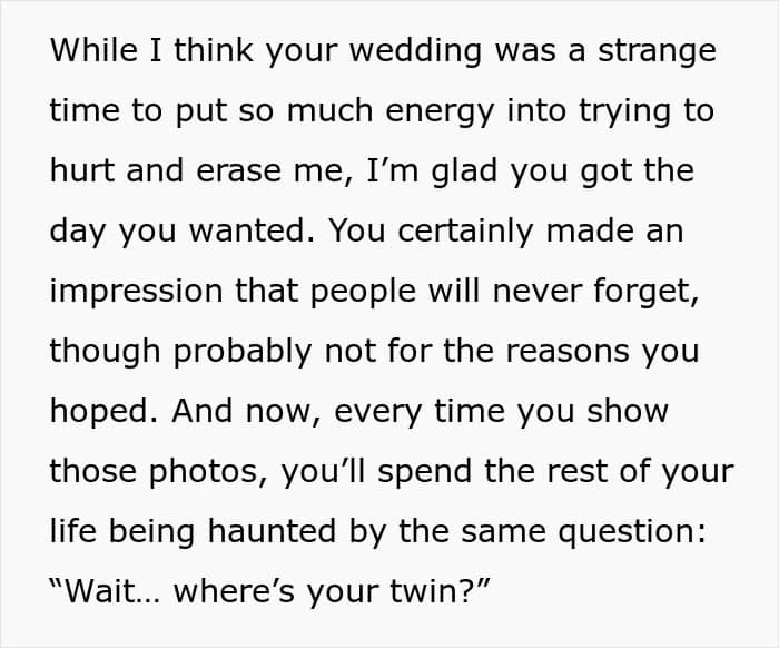 So now, when her sister was getting married, the bride tried to erase literally every mention of her twin from the wedding memories. She didn’t invite her to the bridal party (she lied that there wouldn’t be a party at all), didn’t include her as a bridesmaid, and our heroine didn’t even show up in any of the wedding photos.