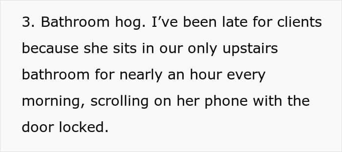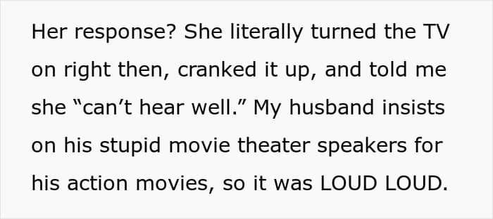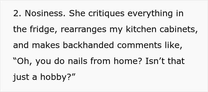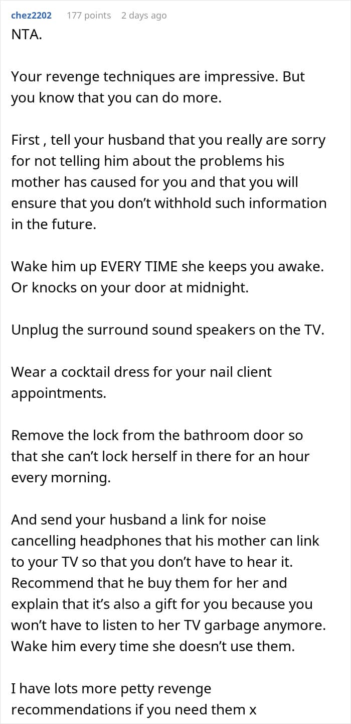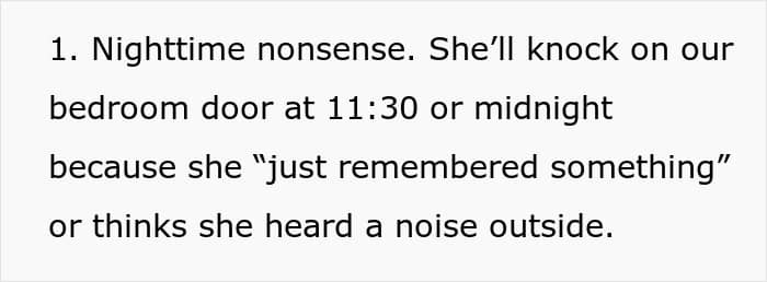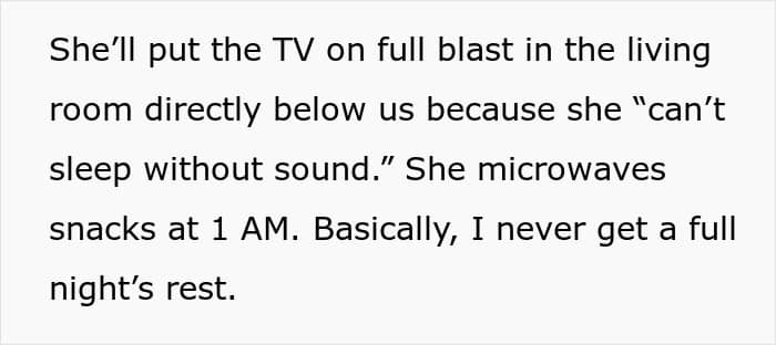 You see, her mother-in-law has some odd habits. Everything from blasting the TV at midnight and knocking on the bedroom door at odd hours, to microwaving snacks at 1 AM and locking herself in the only bathroom every morning. On top of that, she criticizes the fridge, rearranges cabinets, and dismisses OP’s successful career as “just a hobby.”
