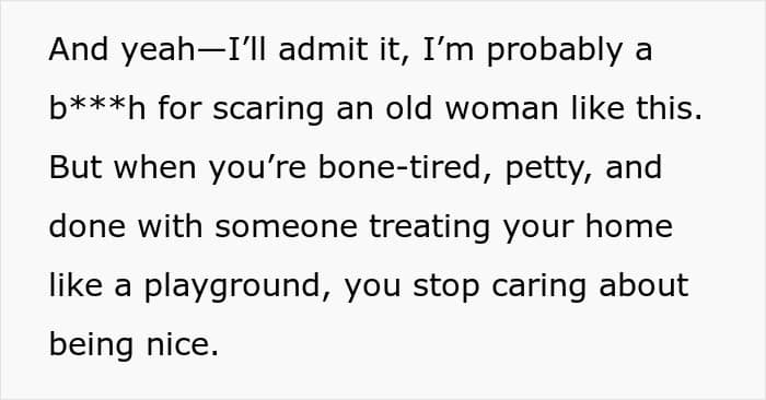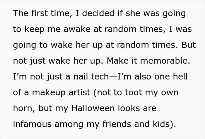 After weeks of exhaustion, OP finally decided to fight fire with fire. As a skilled makeup artist, she began scaring her mother-in-law awake at all hours. One morning, it was a creepy clown. Another time, an inflatable T-Rex. Then, a grizzly bear look, complete with low growls. Each prank left the old woman terrified and, mercifully, temporarily quieter.