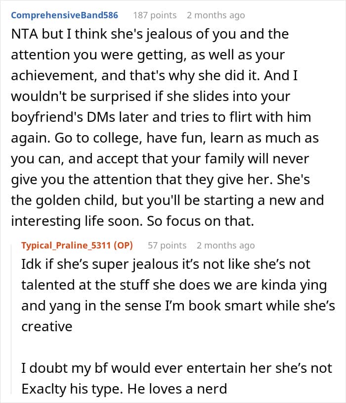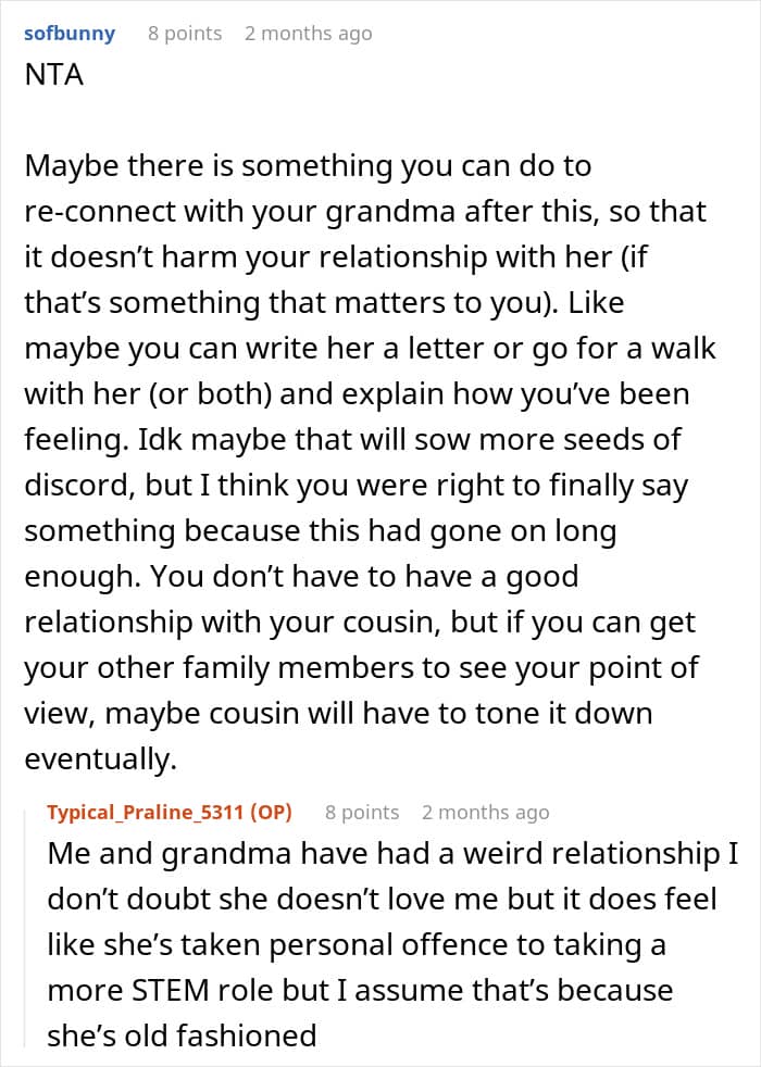 Some responders noted that it would be easier for the original poster in this situation to simply go to college, keep building a relationship with her boyfriend, focus on her studies, and try to forget about her cousin, and leave her in the past. “Ignore these ridiculous people and go on about your business being fabulous,” someone added. Do you, our dear readers, agree with this point of view?