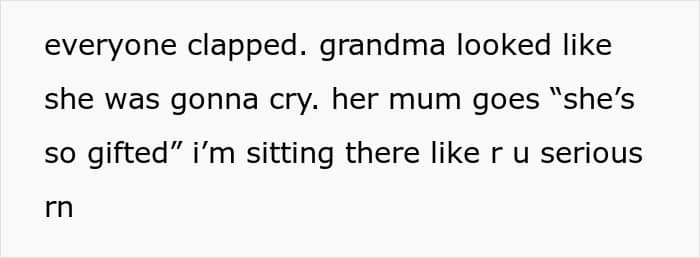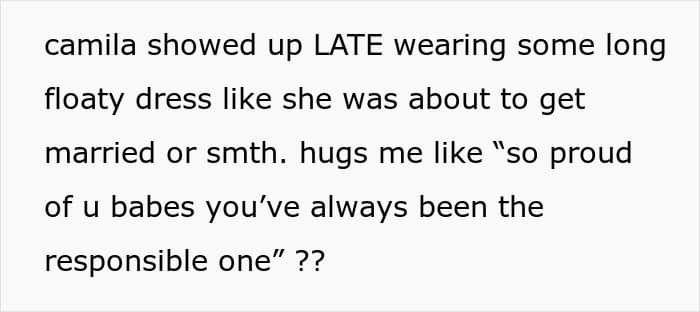 She poured out everything she’d been holding onto over the years to her cousin, accusing her of being self-centered and overly entitled. Camila listened and stormed out in tears. After this, our heroine received a slew of accusations from older relatives about being “cruel,” but, for instance, another cousin texted her that evening, saying that Camila actually got what she deserved…